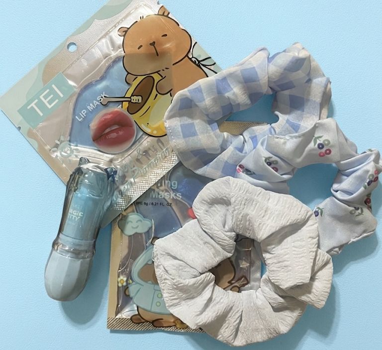 1 Mascarilla para labios + 1 Mascarilla para ojeras + 1 Balsamo Kitty + 3 Scrunchies